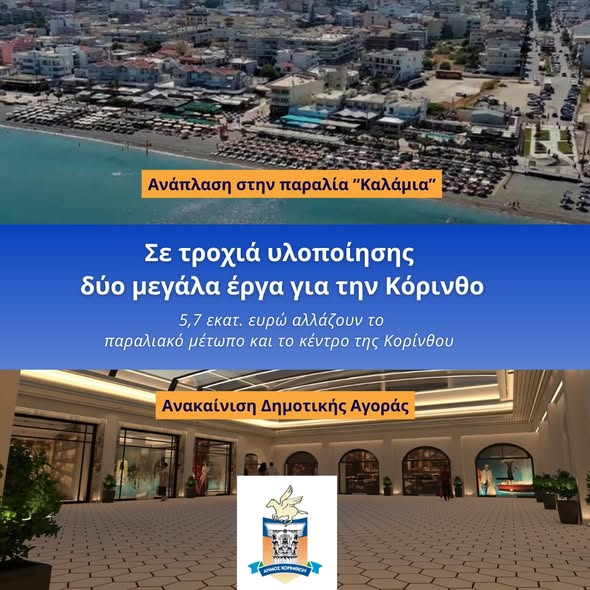 Δύο σημαντικά έργα που αφορούν το παραλιακό μέτωπο και το ιστορικό κέντρο της πόλης προχωρούν στον Δήμος Κορινθίων, μετά την ολοκλήρωση της υποβολής των πλήρων φακέλων χρηματοδότησης για την ανάπλαση της παραλίας «Καλάμια» και την ανακαίνιση της Δημοτικής Αγοράς Κορίνθου.