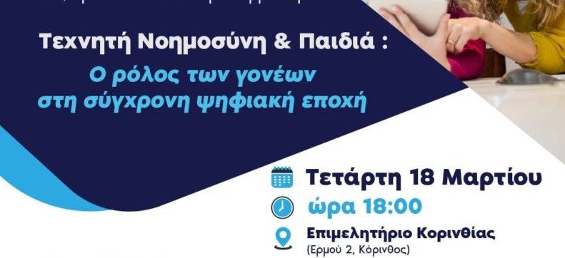 Η εκδήλωση με τίτλο «Τεχνητή Νοημοσύνη και Παιδιά: Ο ρόλος των γονέων στη σύγχρονη ψηφιακή εποχή» θα πραγματοποιηθεί την Τετάρτη 18 Μαρτίου στις 18:00 στο Επιμελητήριο Κορινθίας, στην Κόρινθο.