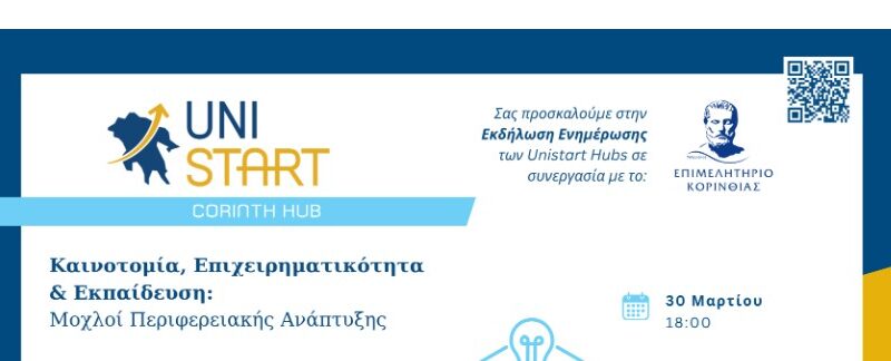 Τα UniStart Hubs, σε συνεργασία με το Επιμελητήριο Κορινθίας, σας προσκαλούν στην εκδήλωση με τίτλο «Καινοτομία, Επιχειρηματικότητα & Εκπαίδευση: Μοχλοί Περιφερειακής Ανάπτυξης», η οποία θα πραγματοποιηθεί τη Δευτέρα 30 Μαρτίου 2026 και ώρα 18:00, στη Δημοτική Βιβλιοθήκη Σικυωνίων στο Κιάτο.