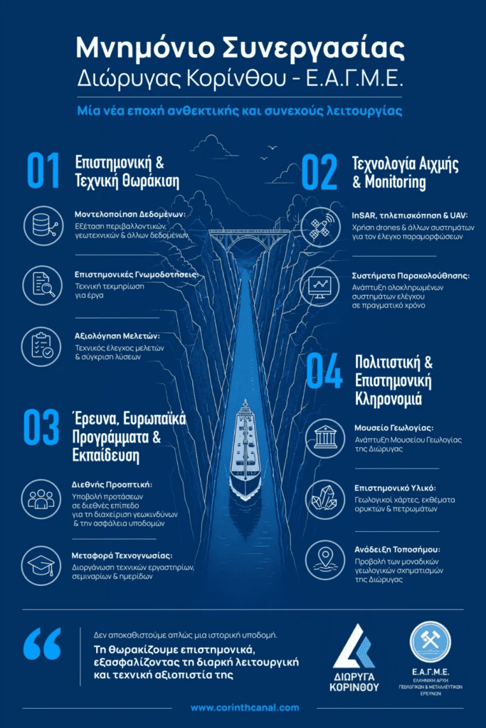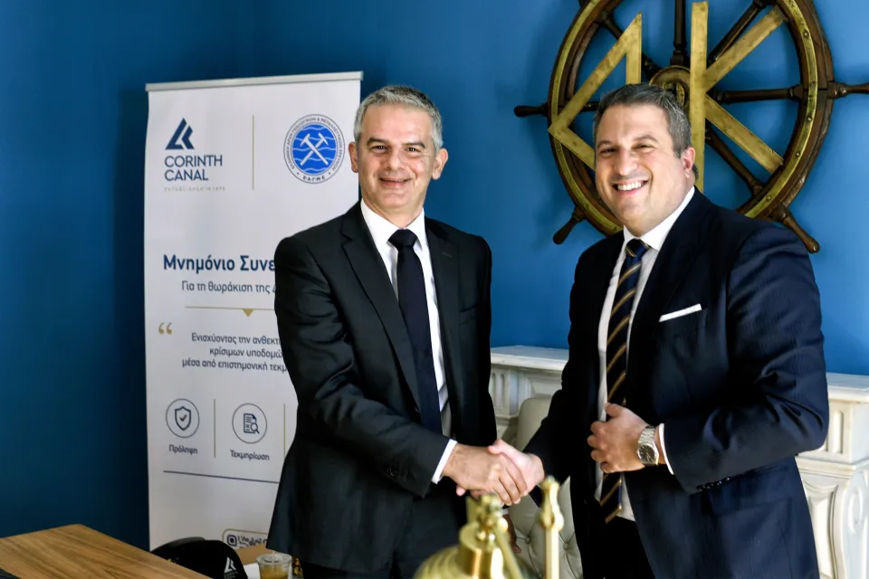 Στην ενίσχυση της ασφάλειας και της επιχειρησιακής αξιοπιστίας της Διώρυγας Κορίνθου στοχεύει το Μνημόνιο Συνεργασίας που υπεγράφη τη Δευτέρα 27 Απριλίου στο Λουτράκι, μεταξύ της Ανώνυμος Εταιρεία Διώρυγας Κορίνθου και της Ελληνική Αρχή Γεωλογικών και Μεταλλευτικών Ερευνών, σηματοδοτώντας μια νέα στρατηγική κατεύθυνση για τη λειτουργία της εμβληματικής υποδομής.