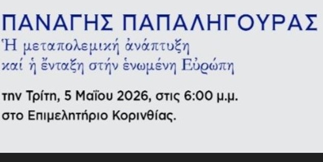 Μια ιδιαίτερα ενδιαφέρουσα εκδήλωση λόγου και ιστορίας θα πραγματοποιηθεί την Τρίτη 5 Μαΐου 2026, στις 18:00, στο Επιμελητήριο Κορινθίας, με αφορμή την παρουσίαση του βιβλίου “Παναγής Παπαληγούρας: Η μεταπολεμική ανάπτυξη και η ένταξη στην ενωμένη Ευρώπη”.