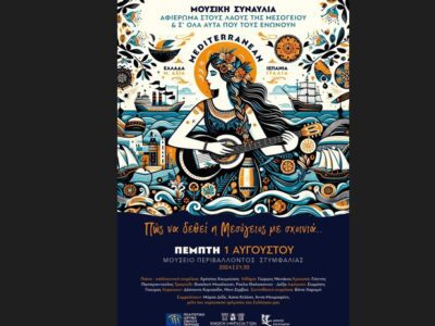 Στο Μουσείο Περιβάλλοντος Στυμφαλίας σε ένα μοναδικά υπέροχο χώρο, θα ταξιδέψουμε στους λαούς της Μεσογείου μέσα από το θέατρο,την ποίηση, την ζωγραφική,το χορό ...